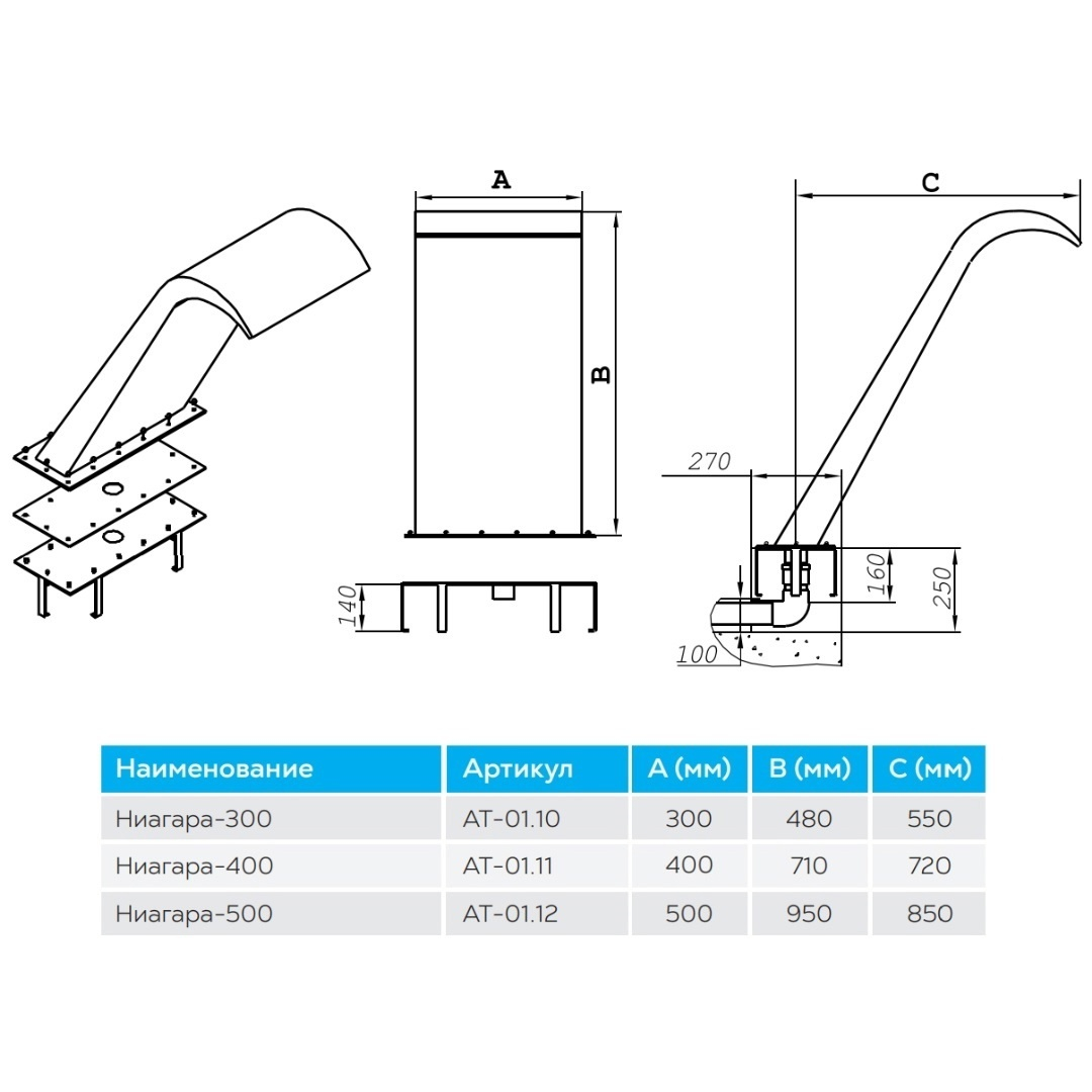Водопад Ниагра 300 Акватехника АТ 01.10 - является декоративным элементом бассейнов и прочих искусственных водоёмов и аквасистем. Изливающийся поток воды оказывает массажирующее воздействие на плечи, шею, голову. Изготовлен из полированной нержавеющей стали, устойчивой к коррозии, воздействию ультрафиолета и химических реагентов.