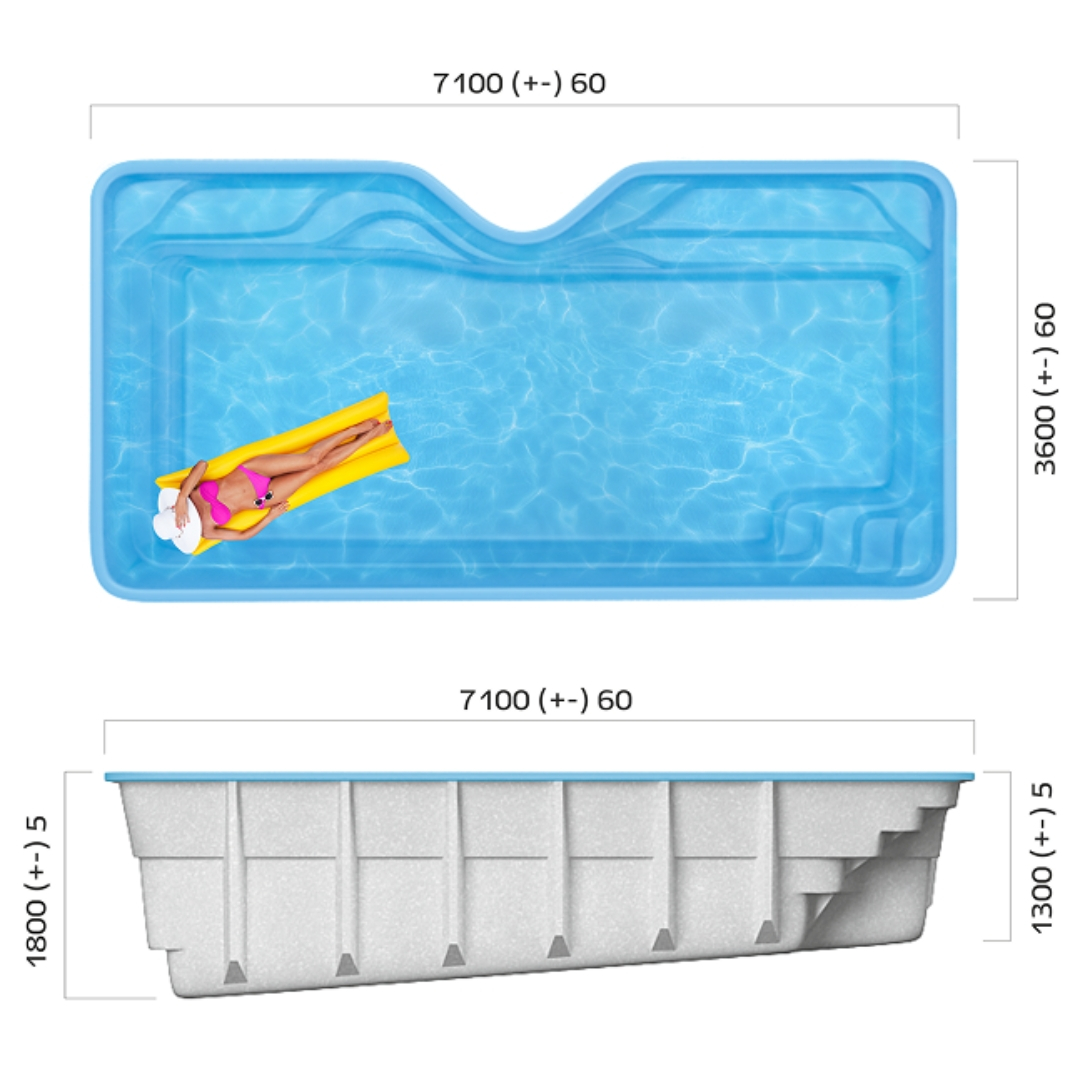 Бассейн состоит из: системы гелькоут, барьерных слоев стекловолокна и эпоксивинилэстеровых смол, усиления карбоном, конструкции из стекловолокна и полиэфирных смол, внешнего топкоута, утепления пенополиуретаном Термопул, защитной алюминиевой эмали и ребер жесткости Frostlock.