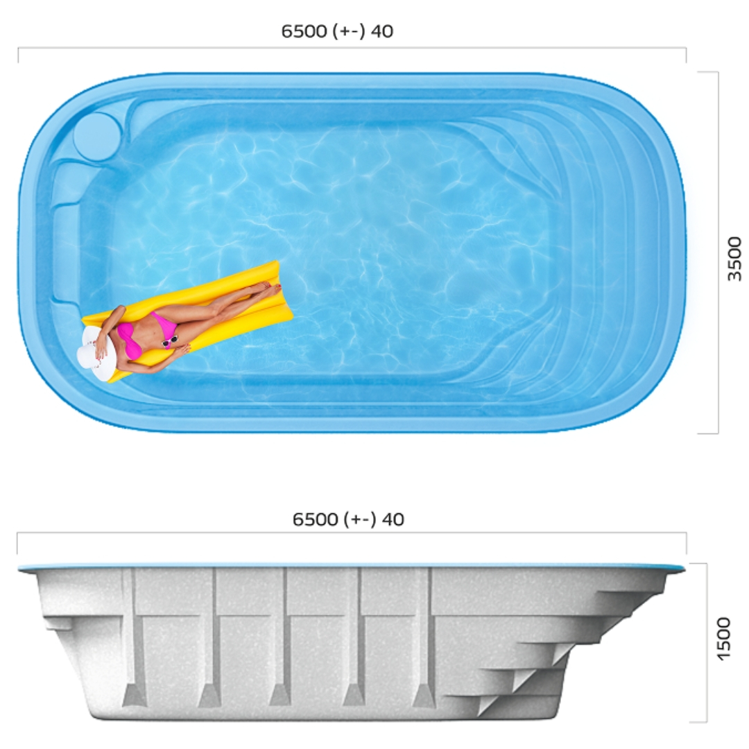 Бассейн состоит из: системы гелькоут, барьерных слоев стекловолокна и эпоксивинилэстеровых смол, усиления карбоном, конструкции из стекловолокна и полиэфирных смол, внешнего топкоута, утепления пенополиуретаном Термопул, защитной алюминиевой эмали и ребер жесткости Frostlock.