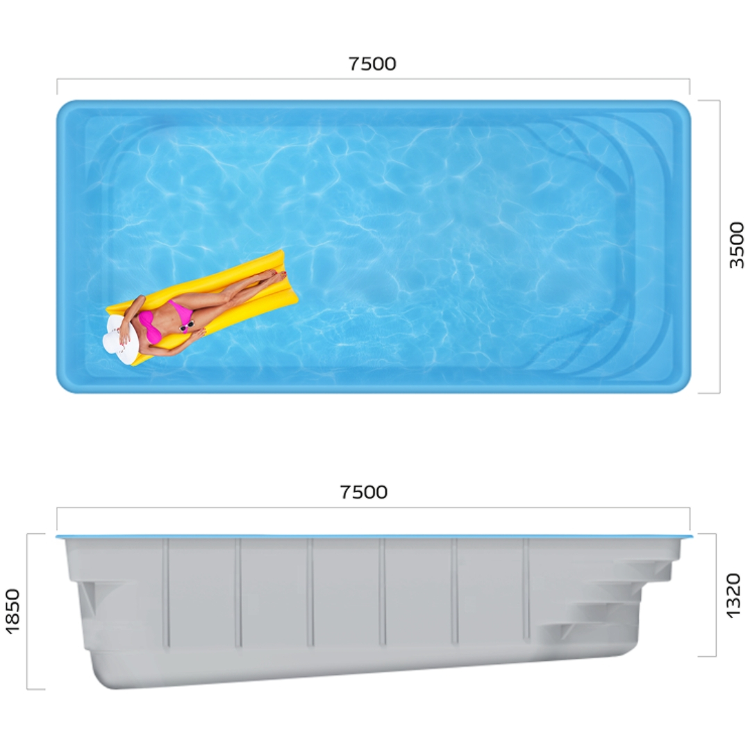 Бассейн состоит из: системы гелькоут, барьерных слоев стекловолокна и эпоксивинилэстеровых смол, усиления карбоном, конструкции из стекловолокна и полиэфирных смол, внешнего топкоута, утепления пенополиуретаном Термопул, защитной алюминиевой эмиали и ребер жесткости Frostlock.