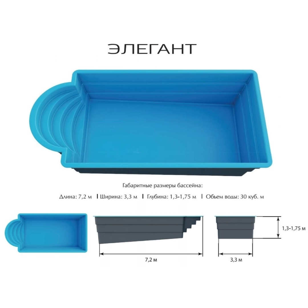 Композитный бассейн Элегант ECOLINE - большой бассейн с классическим дизайном. Прямоугольная чаша имеет переменную глубину от 1,3 до 1,75 метра. Модель оснащена лестницей в римском стиле. Широкие ступени очень удобны для спуска, а также для спокойного отдыха в воде - в качестве сидений. При желании в чашу можно вмонтировать специальные форсунки и дополнить отдых приятным гидромассажем.