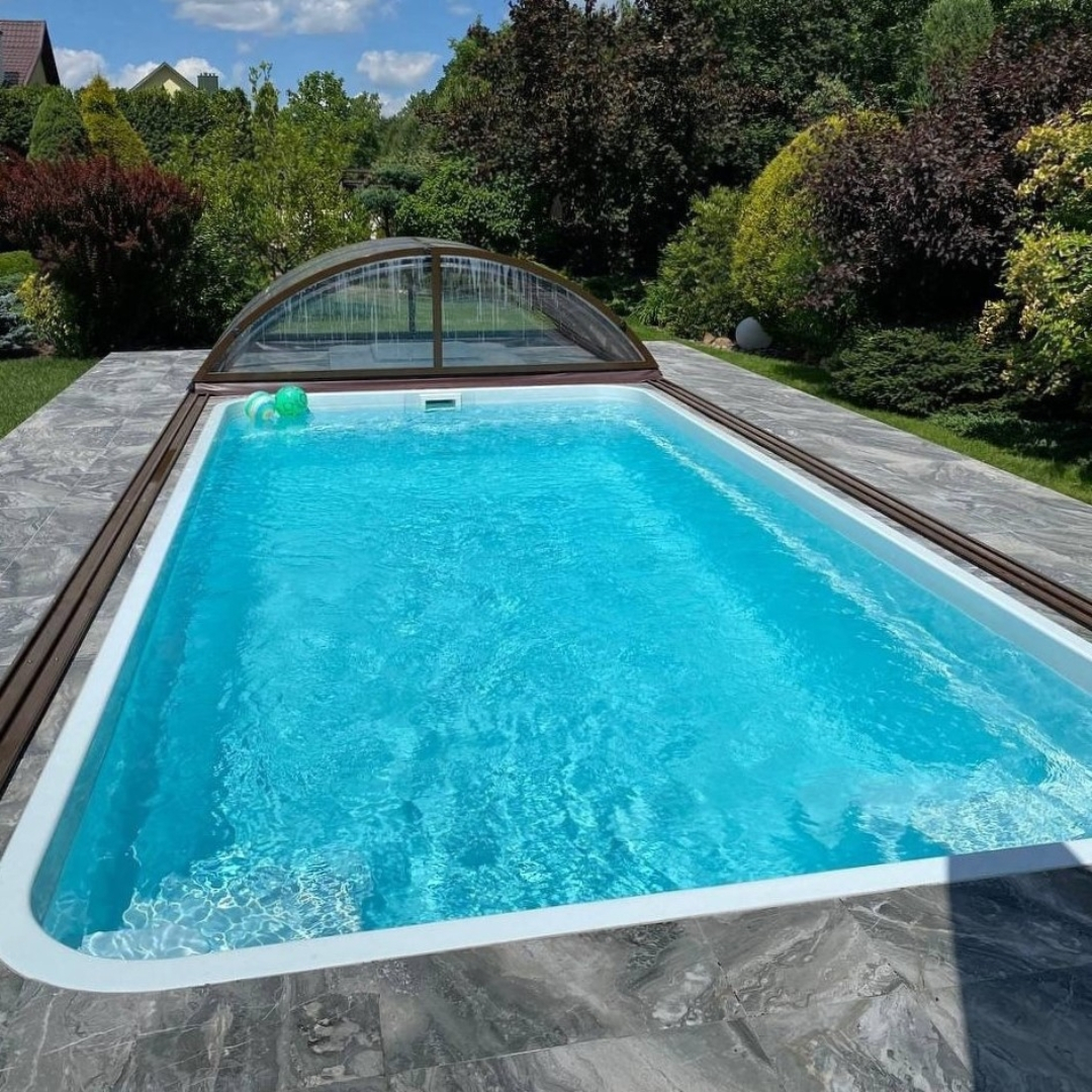 Чаша бассейна изготовлена из многослойного композитного материала, который не подвержен гниению, деформации от температурных перепадов, выгоранию на солнце. Гладкая поверхность без швов и острых углов не склонна к биозарастанию. Слои композитного бассейна включают: декоративное покрытие (гелькоут), химостойкий барьер, конструкционные слои, армирующий слой, ребра жесткости, финишный слой.