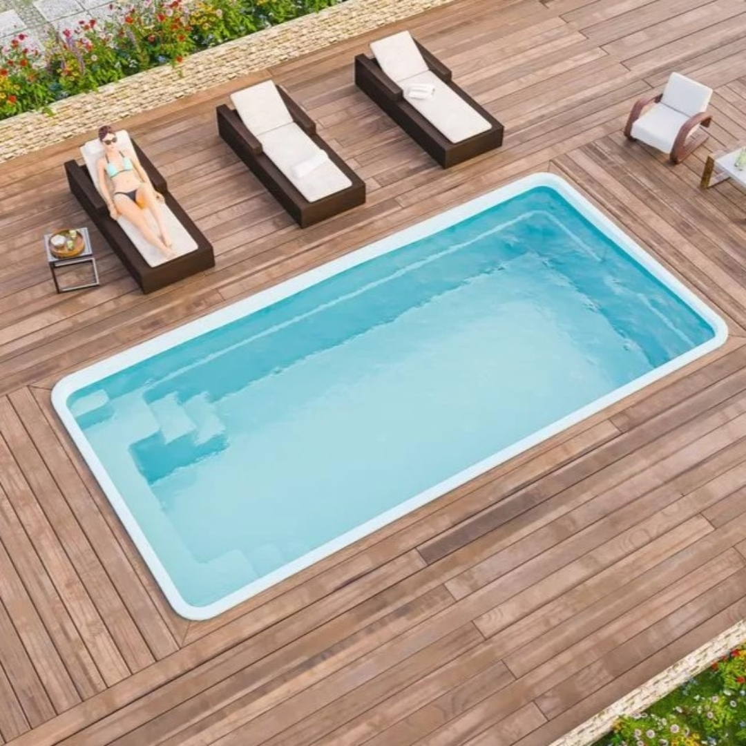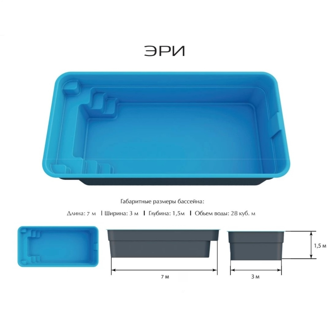 Композитный бассейн Эри 700 ECOLINE - средний бассейн с привлекательным классическим дизайном, который оптимально подойдет для небольшого участка. Чаша имеет классическую прямоугольную форму и постоянную глубину. Для входа в воду по углам предусмотрены неширокие ступеньки. Они минимально сокращают полезное пространство бассейна и могут использоваться в качестве мест для отдыха. Между собой лестницы соединены широким сиденьем - это потенциальная площадка для гидромассажа.