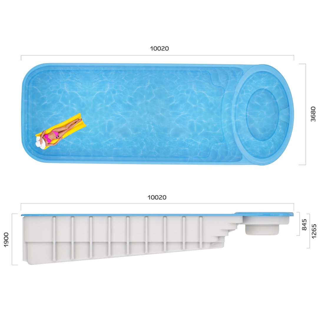 Встроенные опции: лестница, поручень безопасности, переходящая глубина, СПА для гидромассажа, переливной водопад.