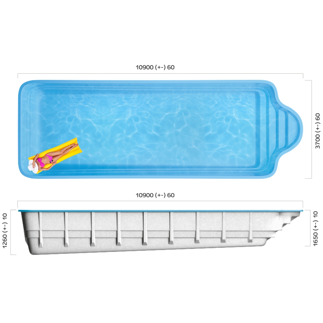 Бассейн состоит из: системы гелькоут, барьерных слоев стекловолокна и эпоксивинилэстеровых смол, усиления карбоном, конструкции из стекловолокна и полиэфирных смол, внешнего топкоута, утепления пенополиуретаном Термопул, защитной алюминиевой эмали и ребер жесткости Frostlock.