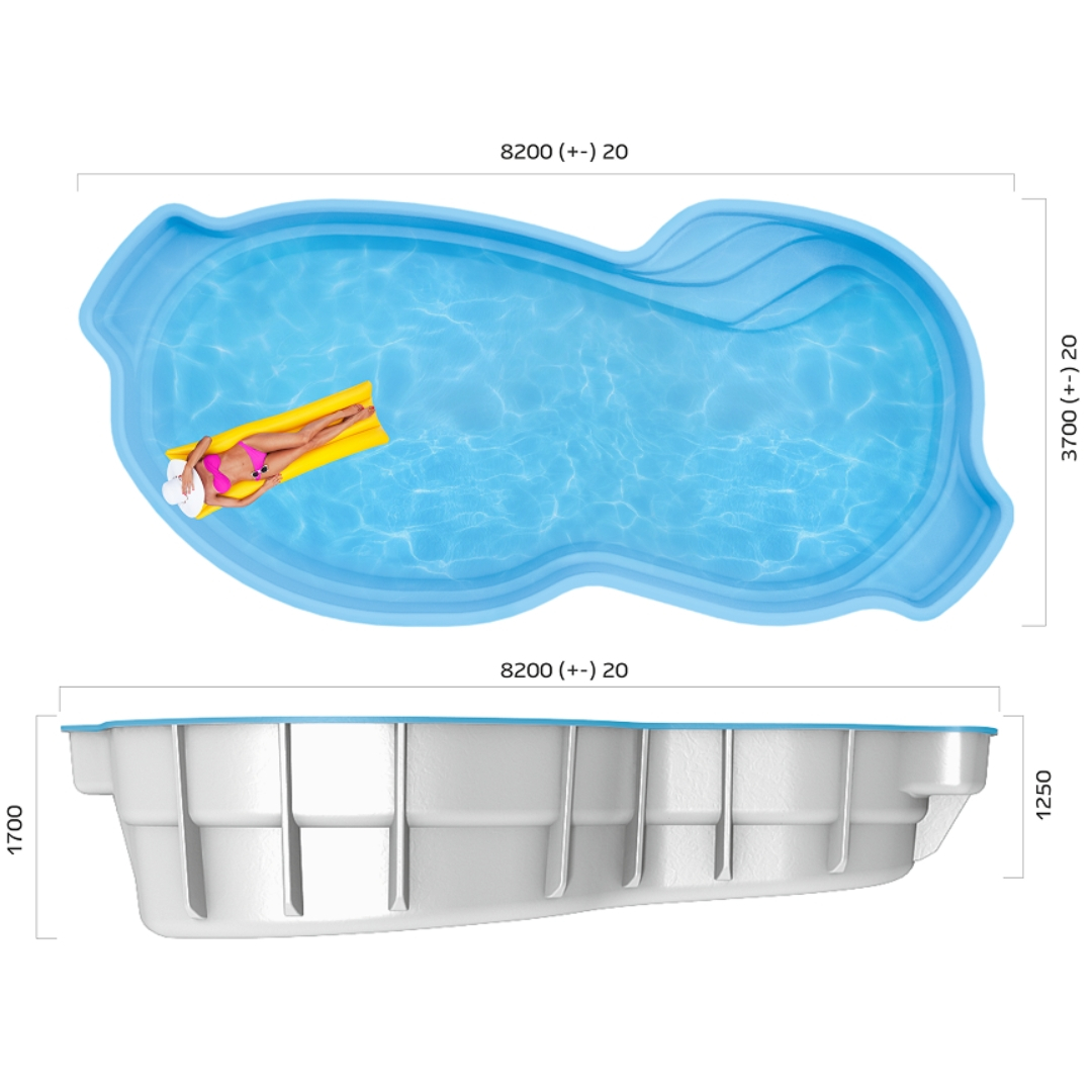 Бассейн состоит из: системы гелькоут, барьерных слоев стекловолокна и эпоксивинилэстеровых смол, усиления карбоном, конструкции из стекловолокна и полиэфирных смол, внешнего топкоута, утепления пенополиуретаном Термопул, защитной алюминиевой эмали и ребер жесткости Frostlock.