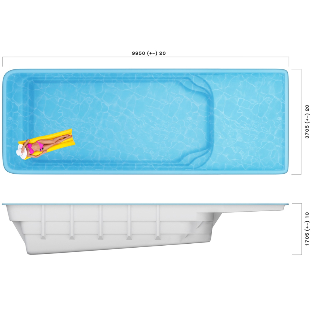 Встроенные опции: лестница, поручень безопасности, переходящая глубина, подводный диван, мелководье для загара.