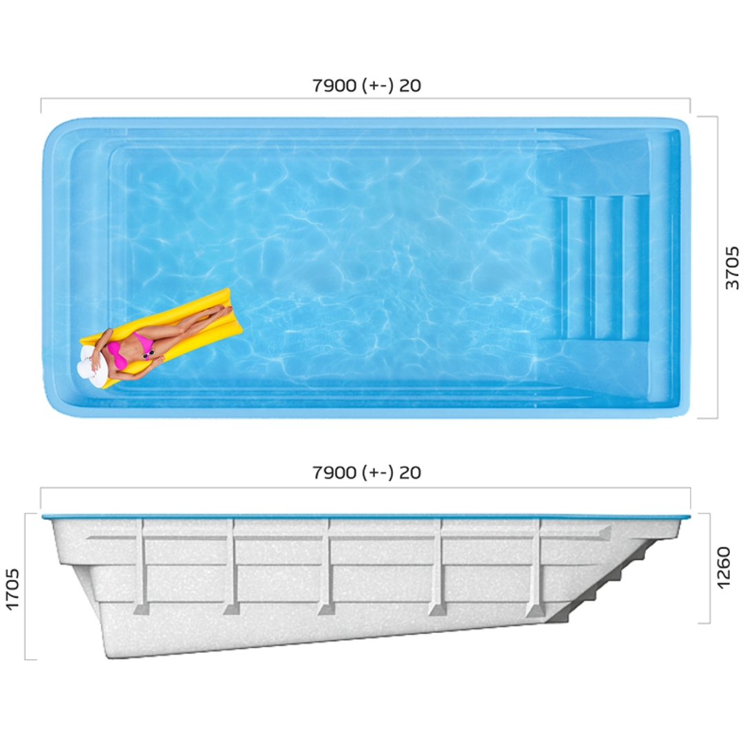 Композитный бассейн Марсель - это центр притяжения вашего дома, где каждому найдется место: от серьезных пловцов до малышей, делающих первые шаги в воде. Идеальный баланс безопасности, функциональности и семейного уюта!