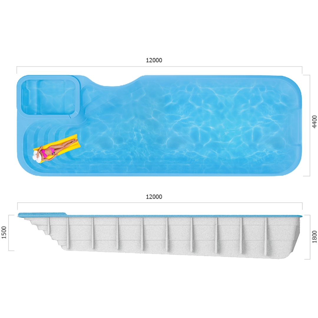 Композитный бассейн Премьер-Spa - бассейн с прохладной водой и теплая СПА-зона с гидромассажем. Продуманная конструкция бассейна, сочетающая возможности полноценного плавания и расслабляющего гидромассажа. Благодаря интеграции СПА-зоны с повышенной температурой воды и основной чаши с прохладной, модель идеально подходит для контрастных процедур, оздоровления и отдыха.