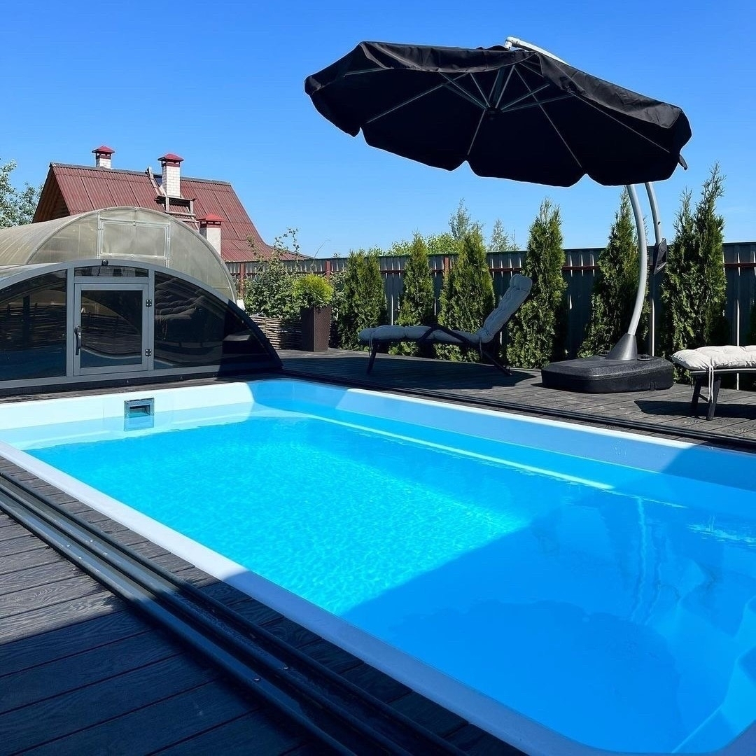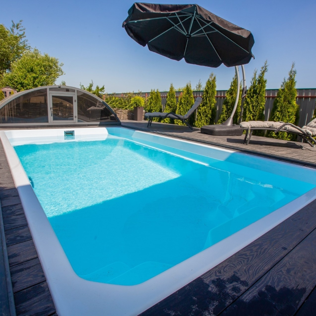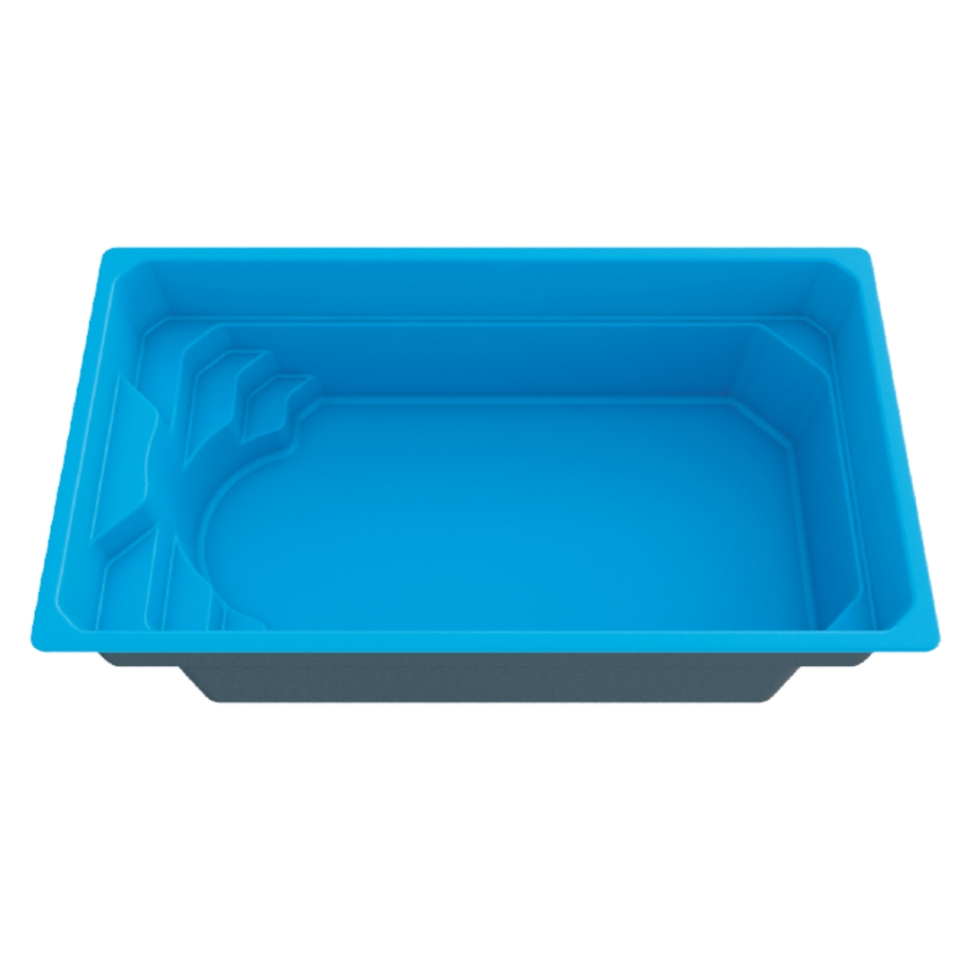 Чаша бассейна изготовлена из многослойного композитного материала, который не подвержен гниению, деформации от температурных перепадов, выгоранию на солнце. Гладкая поверхность без швов и острых углов не склонна к биозарастанию. Слои композитного бассейна включают: декоративное покрытие (гелькоут), химостойкий барьер, конструкционные слои, армирующий слой, ребра жесткости, финишный слой.