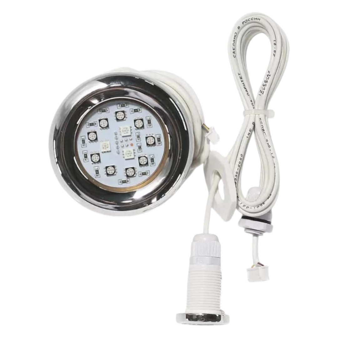 Подсветка для купели - состоит из одной многоцветной диодной лампы. Нажатием кнопки на пульте, лампа меняет цвета на: желтый, синий и красный. Радуга из цветов издает определенные вибрации, благотворно влияющие на организм и эмоциональное состояние.