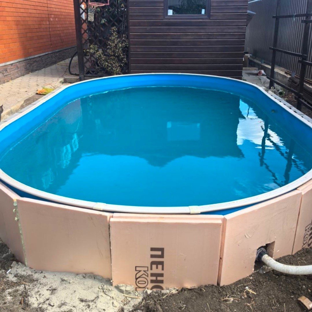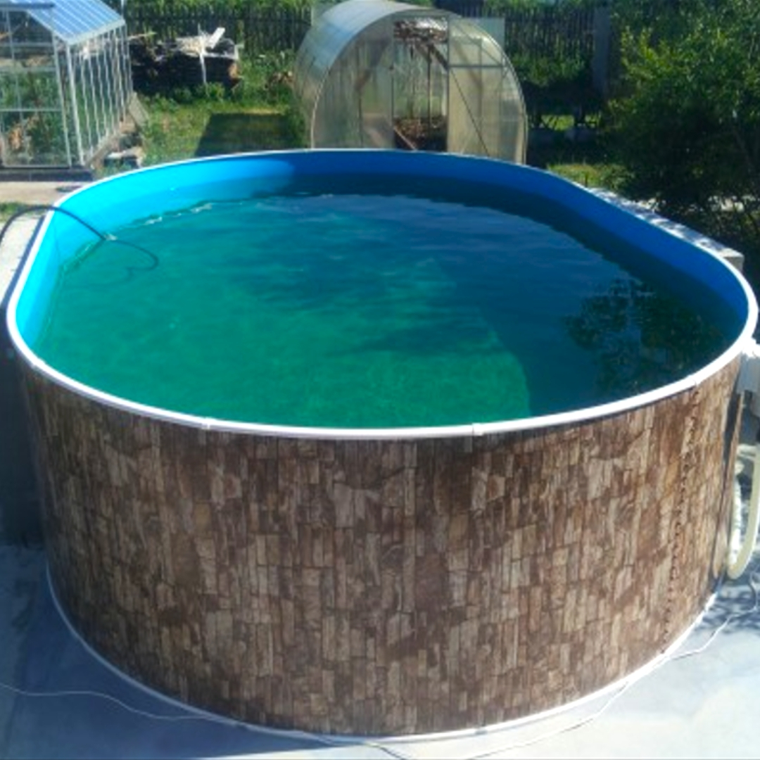 Бассейн выполнен из ламинированной листовой стали армированной поперечным профилем и чашкового ПВХ пакета. Многослойный полимерный ламинат позволяет продлить срок эксплуатации бассейна до 20-25 лет при периодической (раз 7-10 лет) замене чашкового пакета. Замена чашкового пакета производится без демонтажа бассейна.