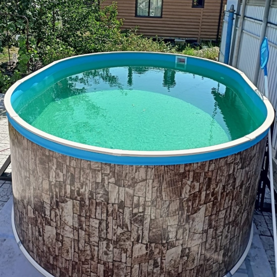 Бассейн выполнен из ламинированной листовой стали армированной поперечным профилем и чашкового ПВХ пакета. Многослойный полимерный ламинат позволяет продлить срок эксплуатации бассейна до 20-25 лет при периодической (раз 7-10 лет) замене чашкового пакета. Замена чашкового пакета производится без демонтажа бассейна.