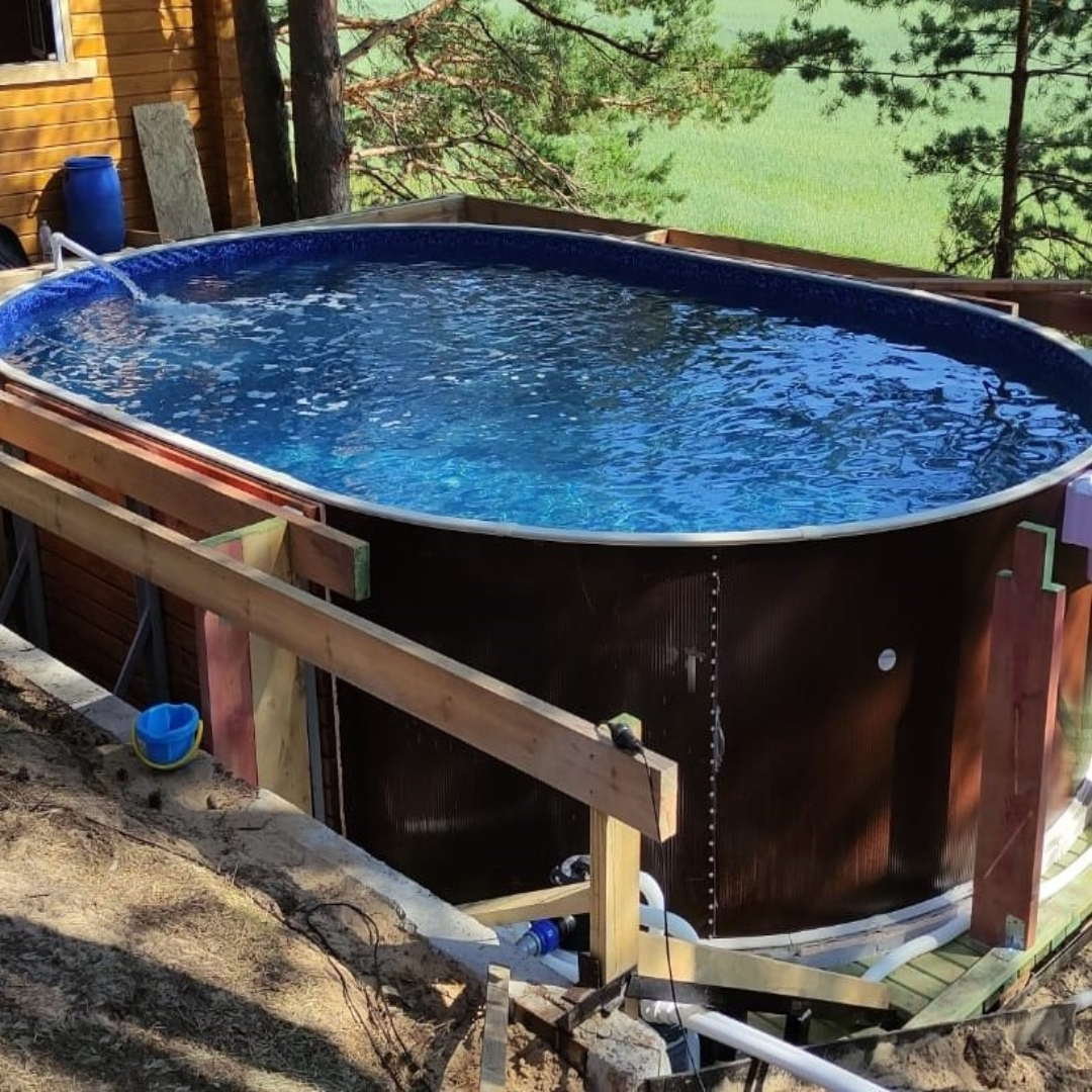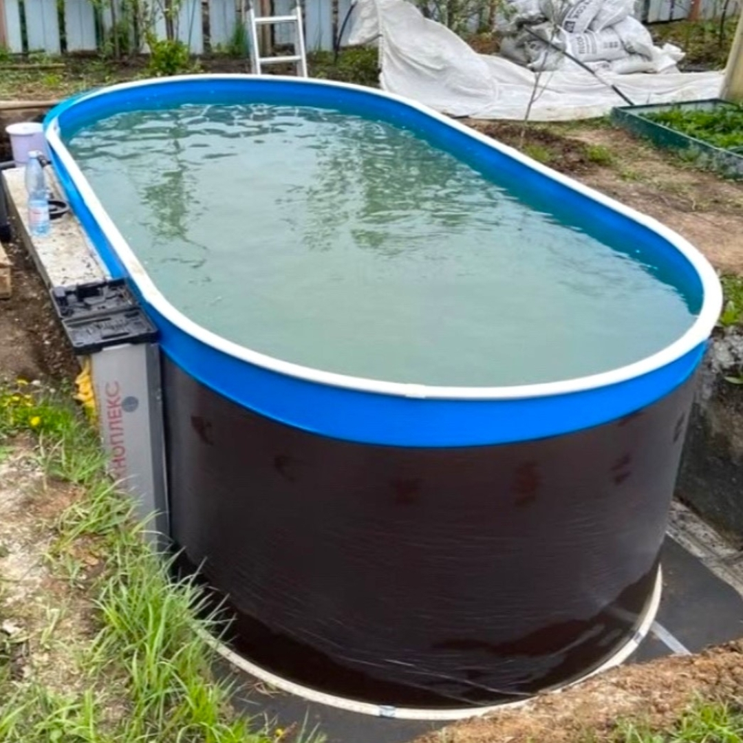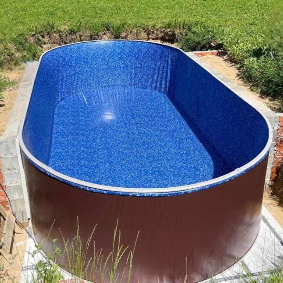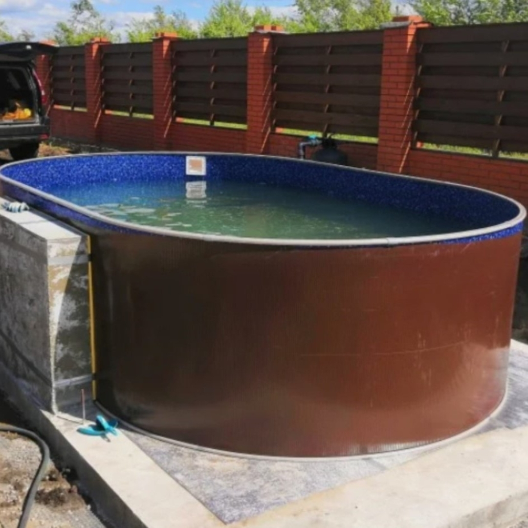 Бассейн выполнен из ламинированной листовой стали армированной поперечным профилем и чашкового ПВХ пакета. Многослойный полимерный ламинат позволяет продлить срок эксплуатации бассейна до 20-25 лет при периодической (раз 7-10 лет) замене чашкового пакета. Замена чашкового пакета производится без демонтажа бассейна.