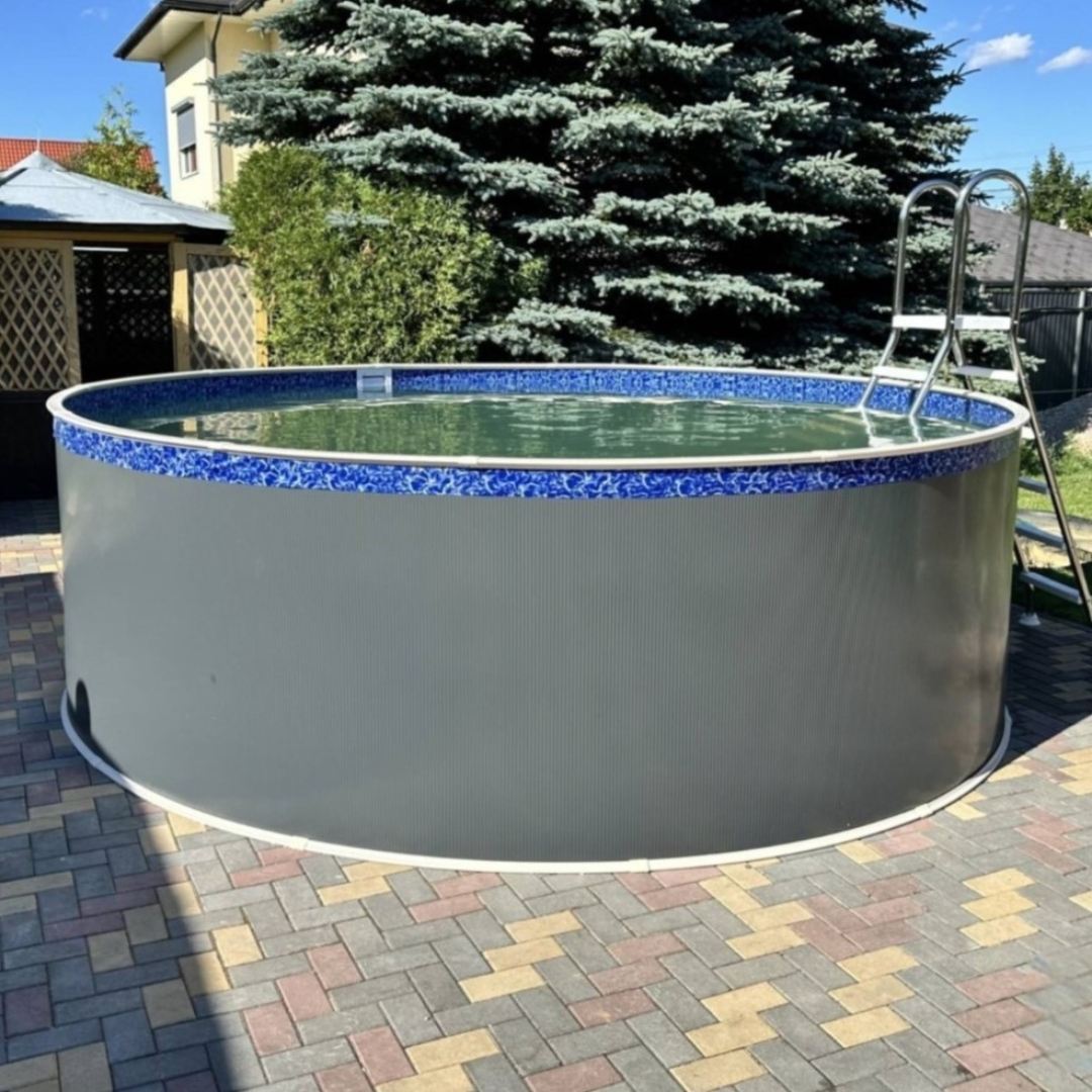 Бассейн выполнен из ламинированной листовой стали армированной поперечным профилем и чашкового ПВХ пакета. Многослойный полимерный ламинат позволяет продлить срок эксплуатации бассейна до 20-25 лет при периодической (раз 7-10 лет) замене чашкового пакета. Замена чашкового пакета производится без демонтажа бассейна.