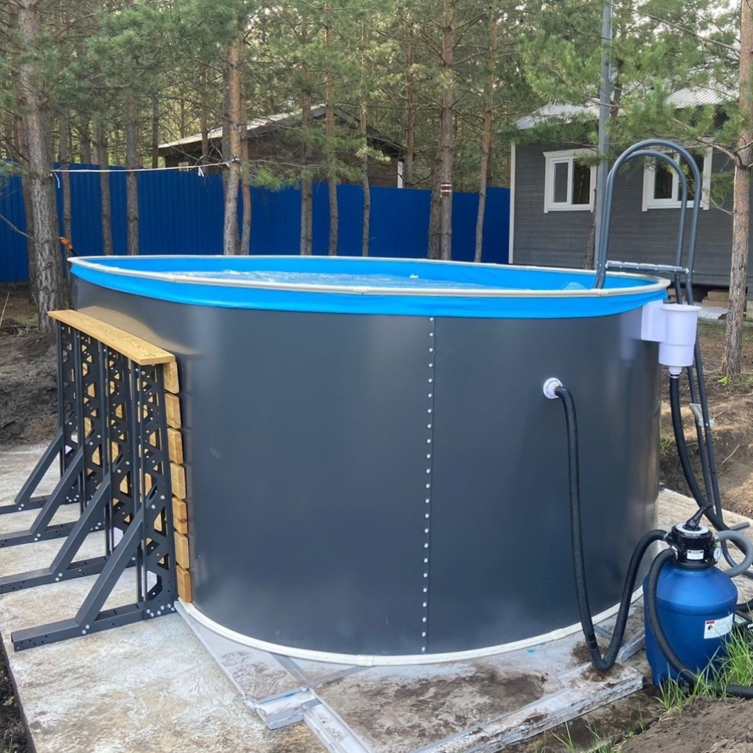 Бассейн выполнен из ламинированной листовой стали армированной поперечным профилем и чашкового ПВХ пакета. Многослойный полимерный ламинат позволяет продлить срок эксплуатации бассейна до 20-25 лет при периодической (раз 7-10 лет) замене чашкового пакета. Замена чашкового пакета производится без демонтажа бассейна.