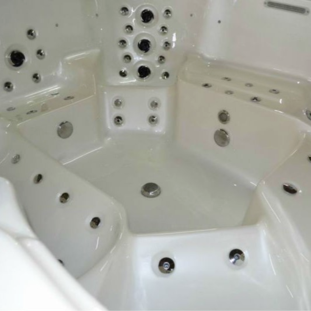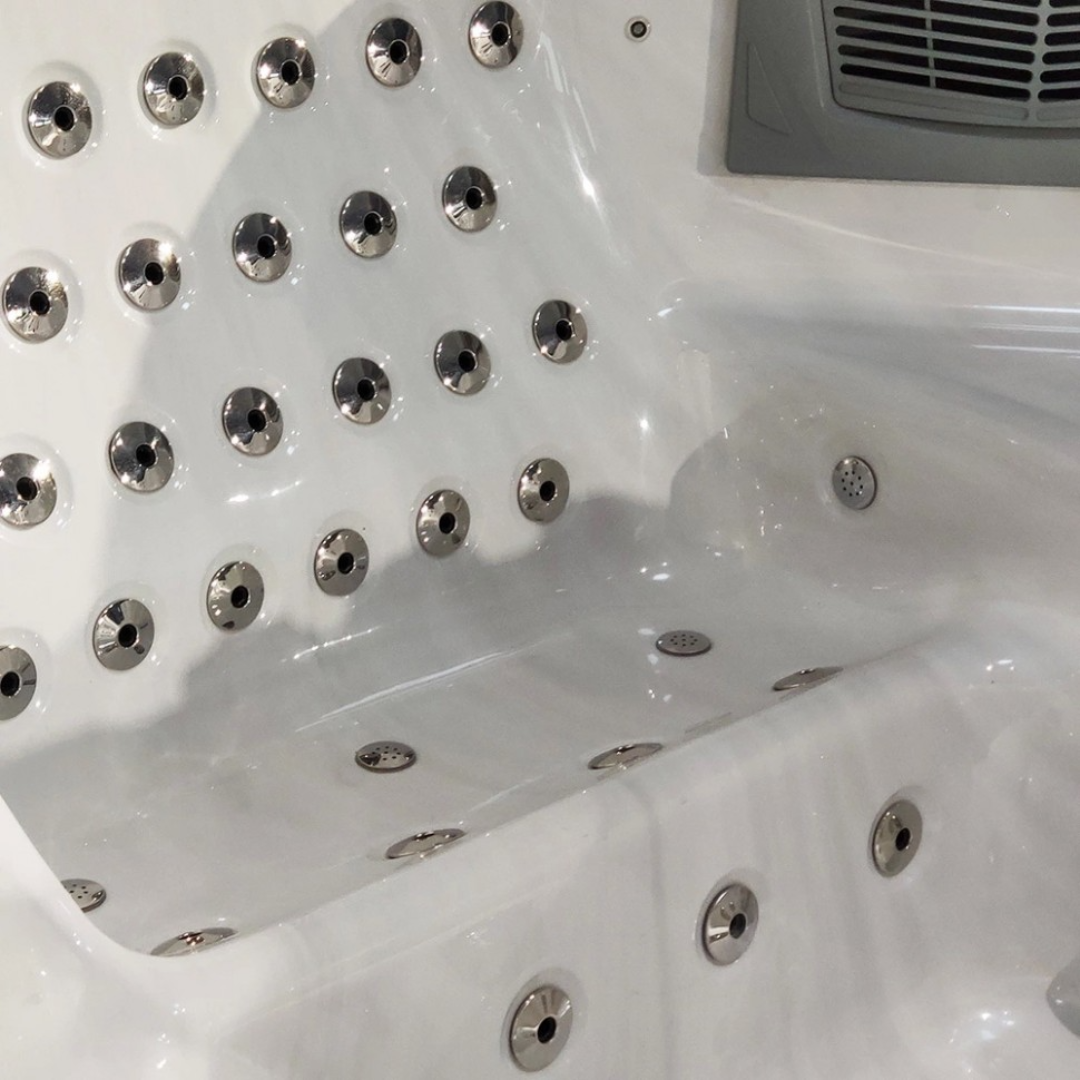 Чаша изготовлена из акрила высочайшего качества. Непористая природа акрилового листа защищает от проникновения и роста микроорганизмов на его поверхности. Стальной каркас полностью оцинкован от коррозии. Придает прочность и долговечность всей конструкции. Форсунки выполнены из нержавеющей стали.