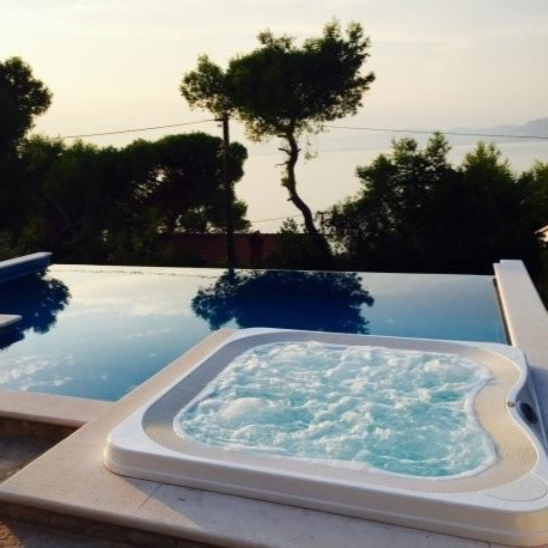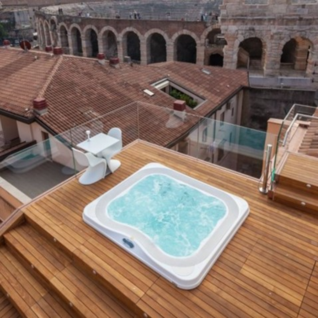 Бассейн оснащен эксклюзивной системой очистки воды, регулируемыми форсунками, аэромассажными форсунками и водопадом для полного гидромассажа с прогрессивной интенсивностью, который позволяет проходить настоящую процедуру оздоровления. Многоцветная светодиодная подсветка спроектирована для создания соответствующей атмосферы.