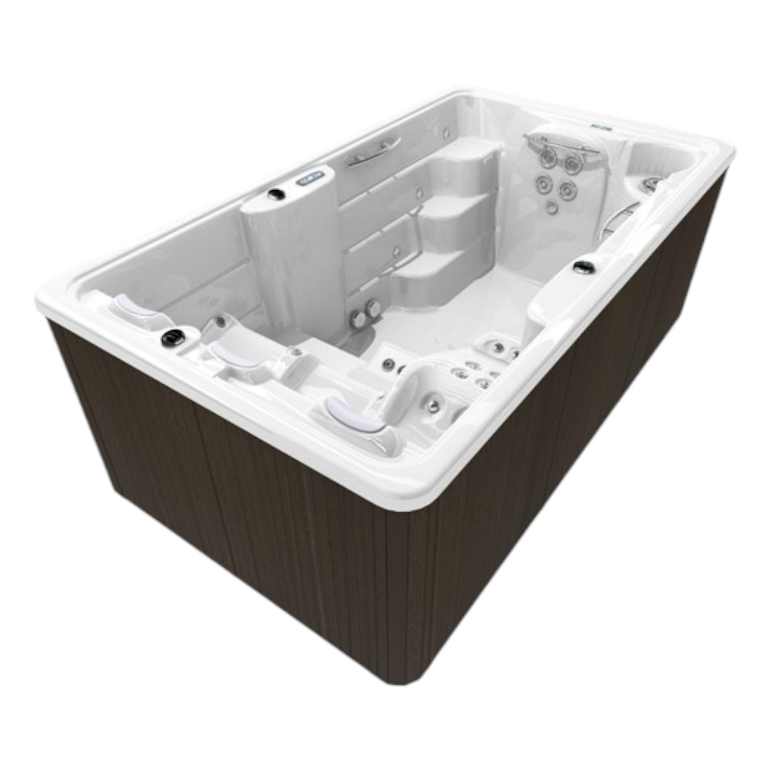 Бассейн оснащен мощными массажными регулируемыми форсунками, массажными насосами, нагревателем воды и панелью управления. За чистоту воды отвечает картриджная система фильтрации и УФ-дезинфекция. Многоцветная подсветка спроектирована для создания соответствующей атмосферы. Плавательный бассейн подходит для установки как на улице, так и в помещении.