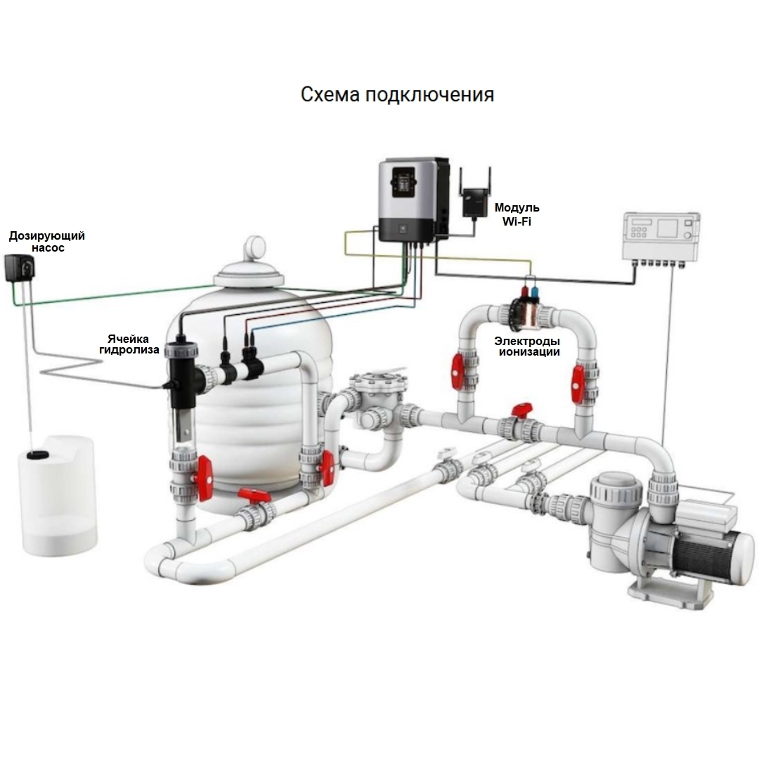 Вспомогательные реле дают возможность подключить дополнительное оборудование к станции контроля. Наличие возможности регулирования уровня pH, ORP и Free Cl воды, а также дистанционного управления станцией по Wi-Fi (опционально).