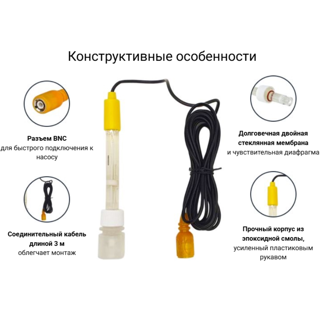 Высокая точность измерений достигается благодаря специальной диафрагме, выполненной из материала Pellon. Наличие стеклянной двойной мембраны увеличивает срок службы датчика вдвое. Корпус электрода изготовлен из эпоксидной смолы. Прибор устойчив к давлению до 6 бар и температуре до 60°С, благодаря специальному гелеобразному электролитному раствору KCL. Быстрое подключение обеспечивается соединительным кабелем с разъемом BNC длиной 3 метра.