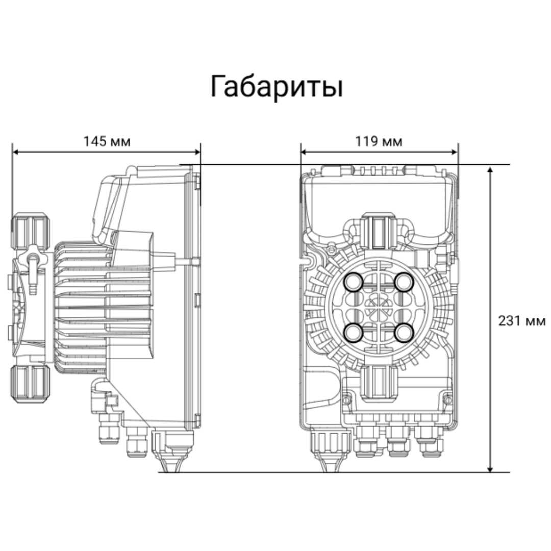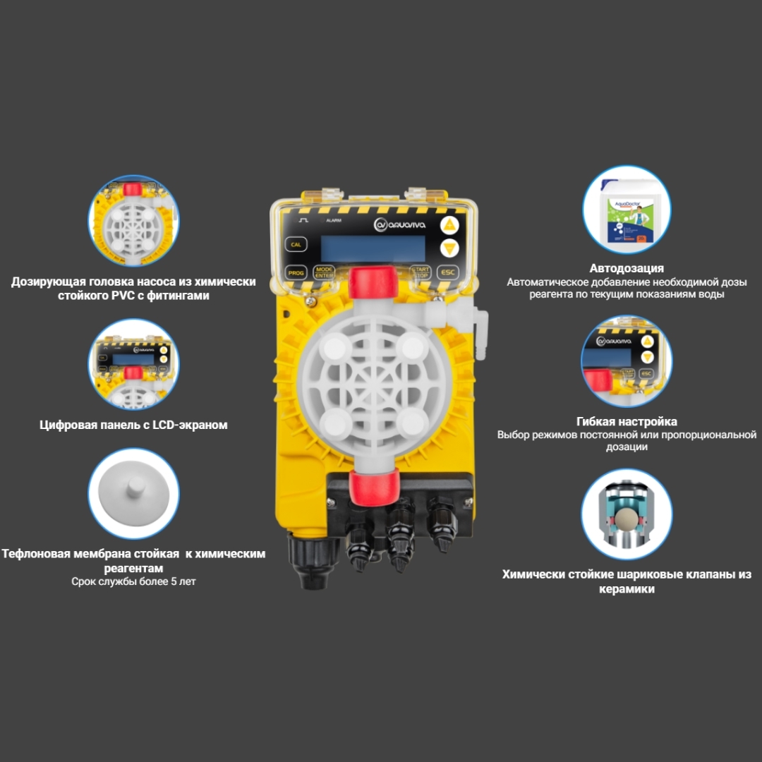 Корпус насоса изготовлен из полипропилена. Головка, клапаны и фитинги выполнены из ПВХ. Оснащен высококачественной мембраной из тефлона и цифровым LCD-дисплеем. Датчик контроля уровня жидкого реагента поставляется в комплекте с дозирующим насосом.