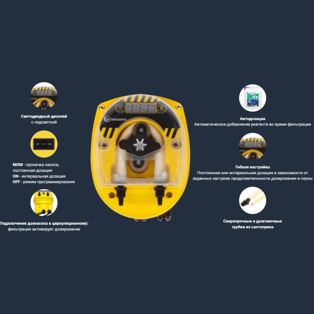 Корпус насоса изготовлен из прочного полипропилена, армированного стекловолокном и защищен прозрачной крышкой. Оснащен высококачественными трубками из сантопрена и LCD-дисплеем. Дозирование по таймеру с регулировкой производительности.
