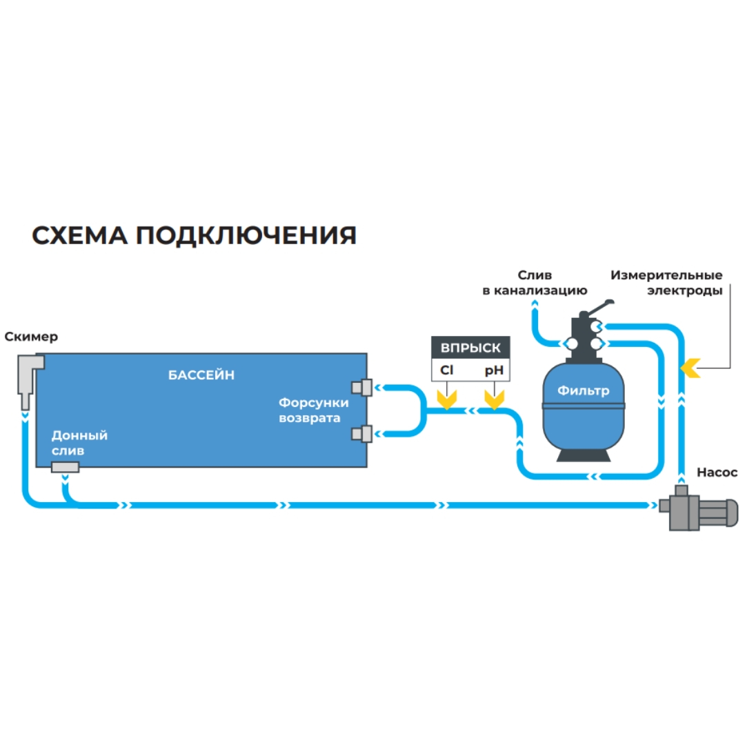 – Возможность подключения любых дополнительных насосов (220В) другого типа для увеличения объема подачи химических реагентов в систему водоподготовки бассейна.