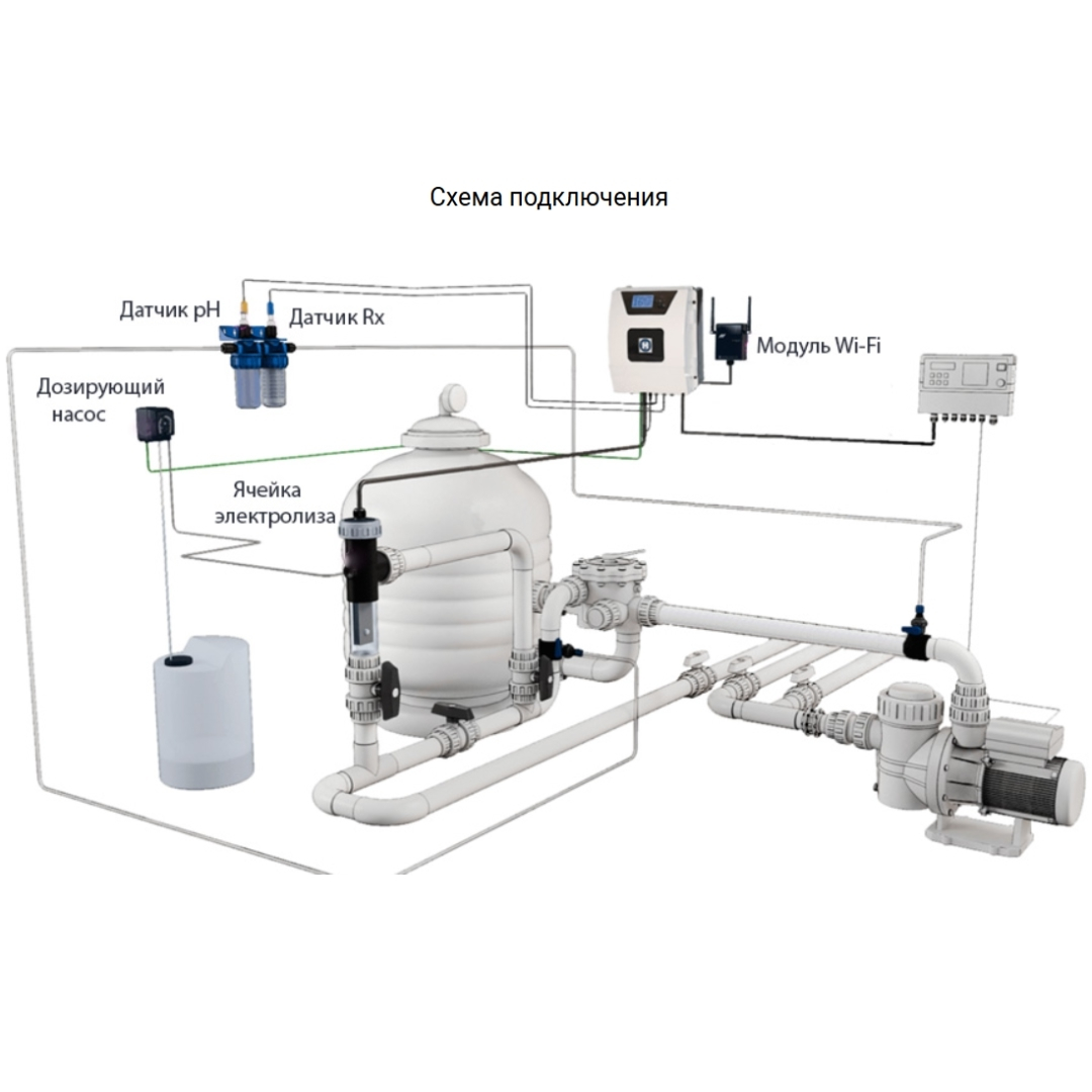 В основу работы станции заложен цикличный принцип преобразования соли в свободный хлор, при помощи выносной электролитической ячейки. Вырабатываемый хлор препятствует появлению и распространению водорослей, микробов и бактерий в воде бассейна. Наличие возможности регулирования уровня pH и ORP воды, а также дистанционного управления станцией по Wi-Fi (опционально).