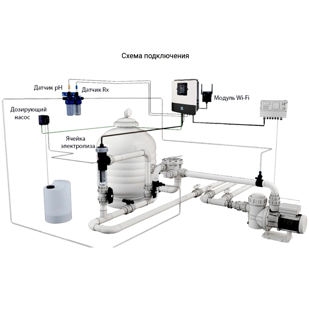 В основу работы станции заложен цикличный принцип преобразования соли в свободный хлор, при помощи выносной электролитической ячейки. Вырабатываемый хлор препятствует развитию водорослей, микробов и бактерий в воде бассейна. Наличие возможности регулирования уровня pH, ORP и Free Cl воды, а также дистанционного управления станцией по Wi-Fi (опционально).