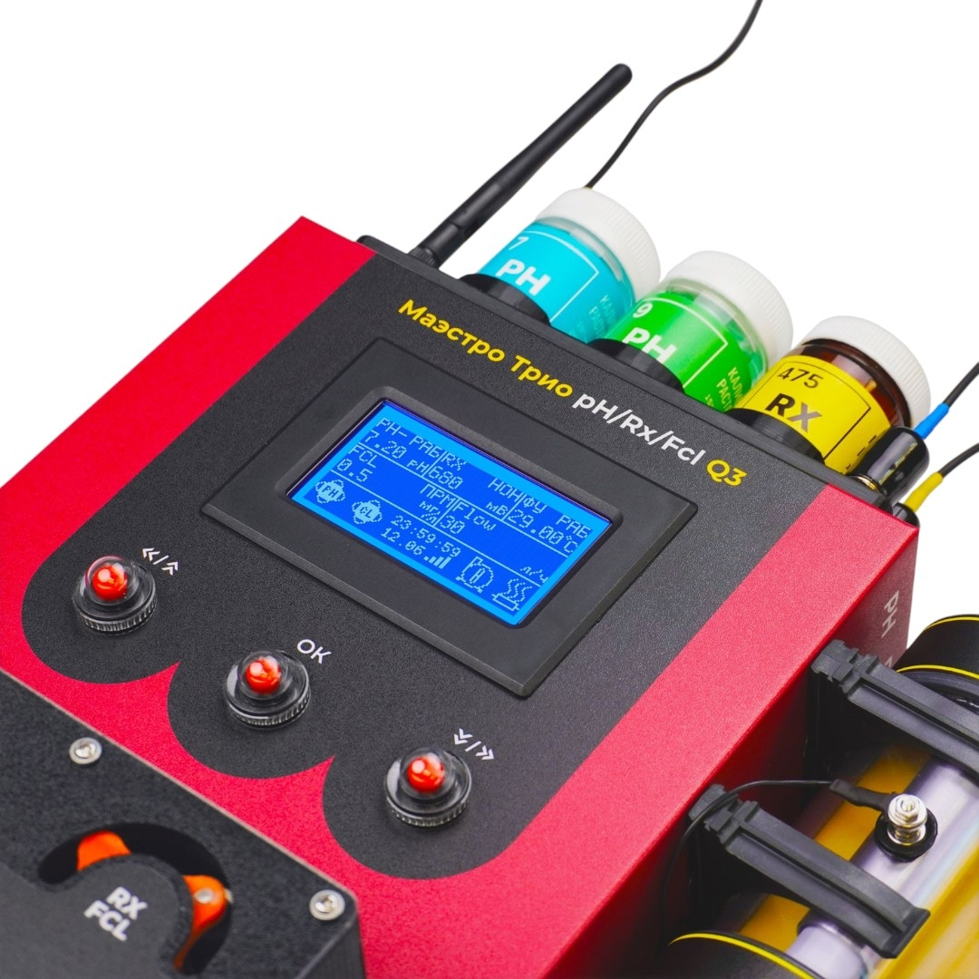 Маэстро Q3 Трио pH/Rx/FreeCI - автоматическая станция контроля и дозирования по трем параметрам (pH, редокс и свободный хлор). Управляет насосом фильтрации и нагревом. Wi-Fi, TelePool, удаленный мониторинг, журнал действий пользователя, дистанционные настройки, уведомления в Telegram. Датчики устанавливаются в ячейку Ø63 мм.