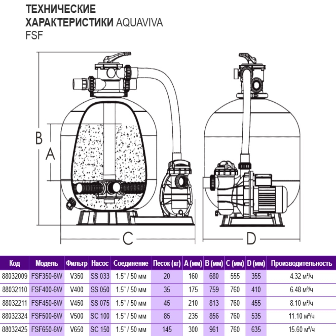 Фильтрационная система Aquaviva FSF500 - используется для очистки воды от механических примесей и взвесей. Установка с верхним расположением многоходового вентиля разработана для фильтрации воды частных бассейнов и SPA. Фильтрующий материал - кварцевый или стеклянный песок.