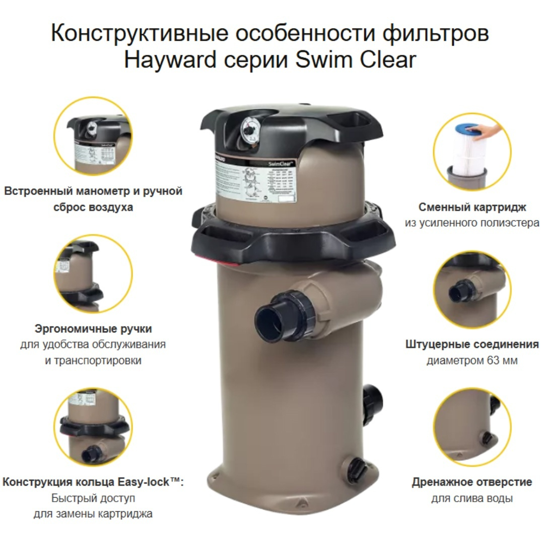 Фильтр Hayward Swim Clear C200SE - предназначен для наземных и заглубленных бассейнов, а также купелей и СПА. Изготовлен из высокопрочного полимера усиленного стекловолокном, что гарантирует надежность и эффективность работы в самых неблагоприятных условиях окружающей среды.