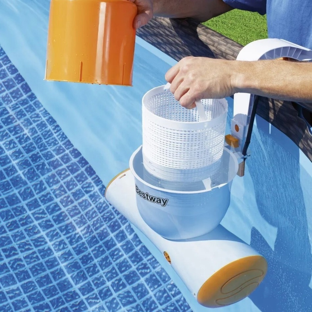 Фильтрация воды осуществляется при помощи сменного картриджа. Благодаря большой скиммерной корзине и автоматическому засасыванию воды, выполняется очистка зеркала бассейна от листьев, насекомых, грязи и прочего поверхностного мусора.