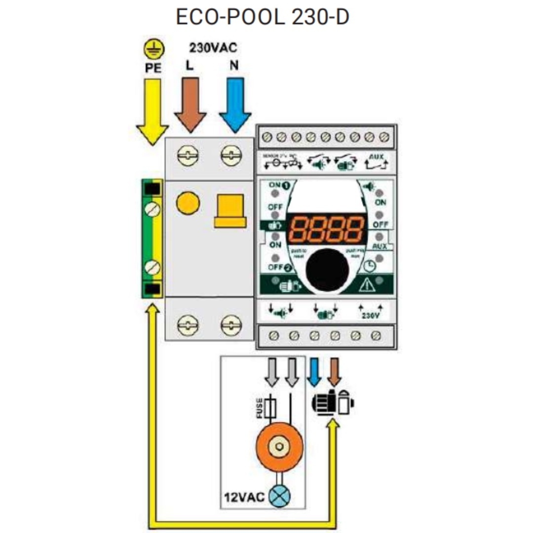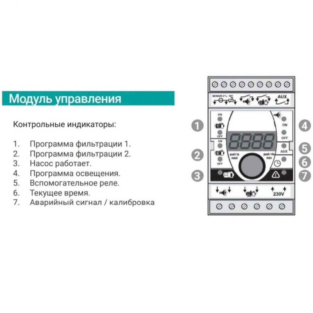 Панель управления Toscano Eco-Pool-230-D - используется для контроля фильтрационной системы бассейна и работы однофазного насоса. Оснащена автоматическим выключателем дифференциального тока, программируемым таймером, простым интерфейсом и модулем Bluetooth, что позволяет управлять с экрана смартфона (через T-link Piscine App). Функции светодиодных индикаторов: работа насоса, тревога, фильтрационные программы, вспомогательный выход, текущее время.