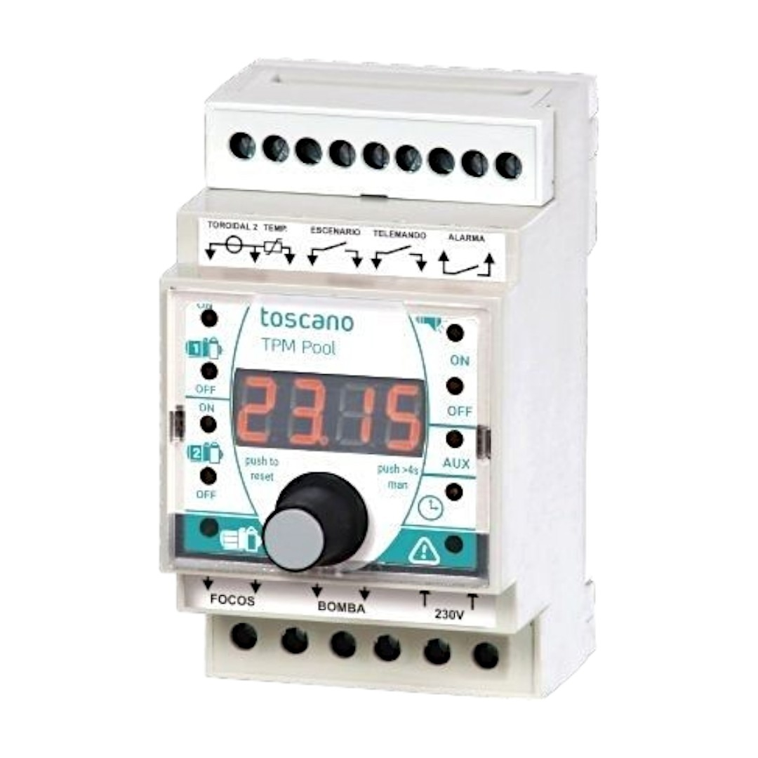 Универсальная панель управления Toscano TPM-Pool-B - используется для контроля и защиты бассейнового оборудования. Позволяет управлять насосом, фильтрацией, освещением и дополнительными устройствами. Предусмотрены защитные опции: перегрузка, недогрузка, потеря фазы. Светодиодные индикаторы: фильтрация, тревога, временные программы, вспомогательный выход, текущее время.