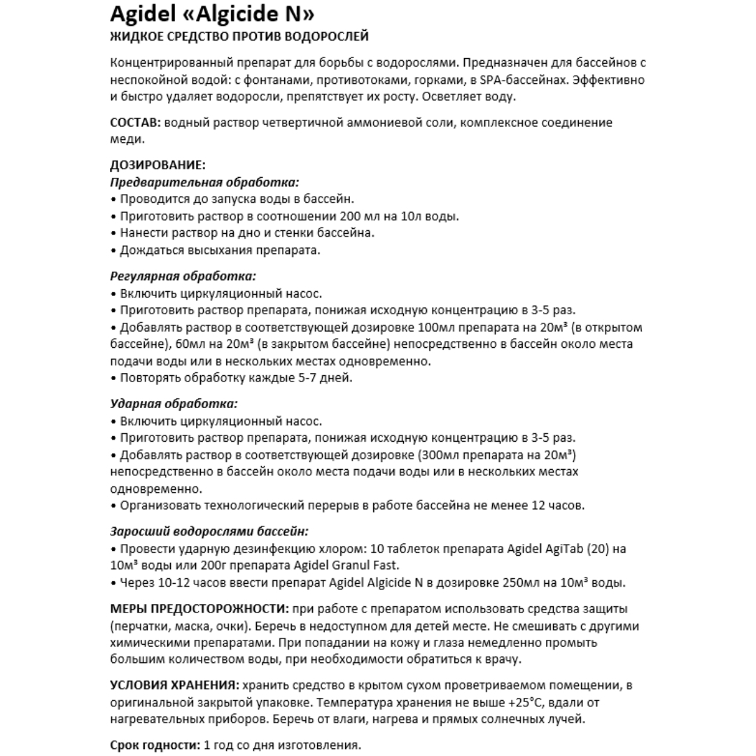 Agidel Algicide N - жидкое непенящееся концентрированное средство для борьбы с водорослями. Предназначено для бассейнов с неспокойной водой: с фонтанами, горками, противотоками, в SPA-бассейнах. Эффективно и быстро удаляет водоросли, препятствует их росту. Не образует пены даже в условиях подвижной воды.
