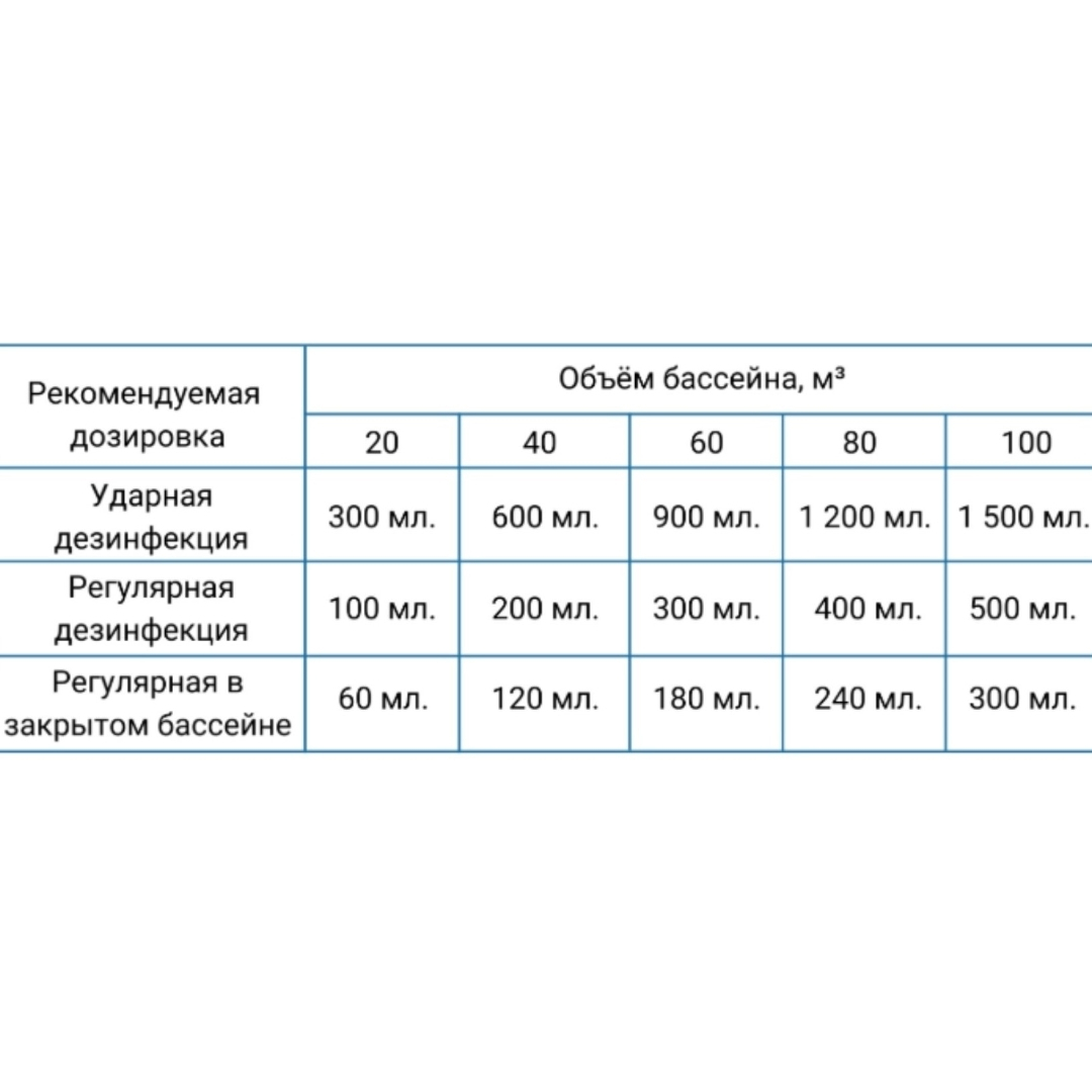 • Регулярная обработка (открытый бассейн): 100мл на 20м³ воды (каждые 5-7 дней)