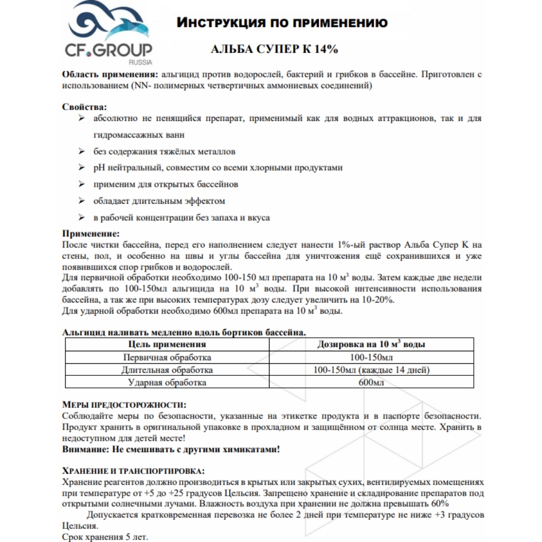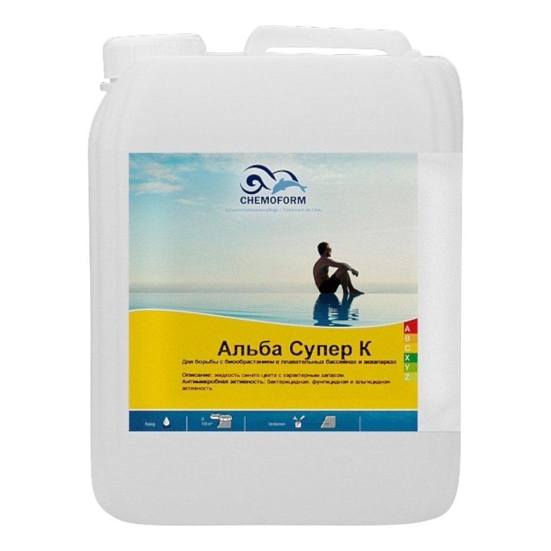 Chemoform Альба Супер К (Альгицид) - высококонцентрированная жидкость, которая предотвращает появление и рост водорослей на стенках бассейна. Может использоваться как для первичной обработки после чистки бассейна, так и для регулярного обеззараживания и поддержания воды в чистоте.