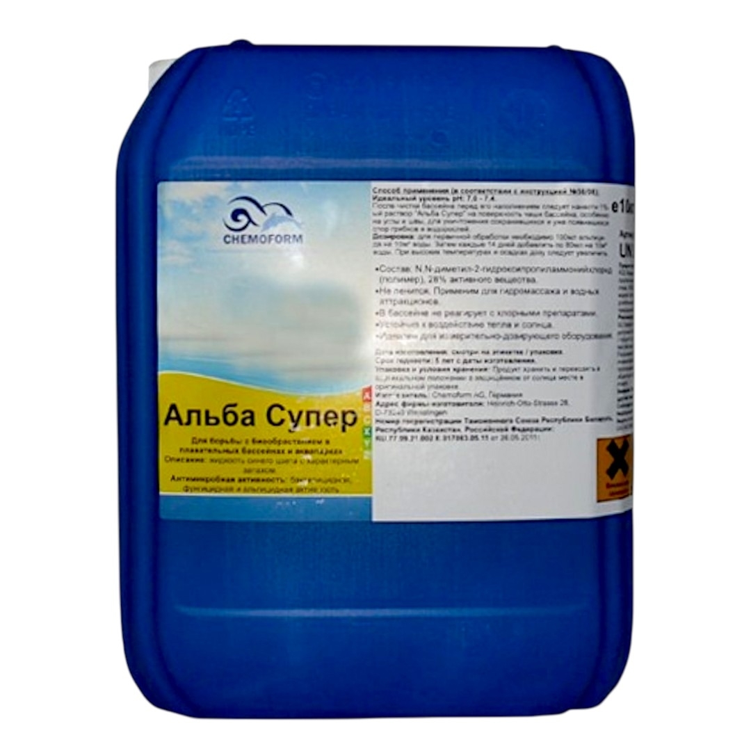 Chemoform Альба Супер (Альгицид) - высококонцентрированная жидкость, которая предотвращает появление и рост водорослей на стенках бассейна. Может использоваться как для первичной обработки после чистки бассейна, так и для регулярного обеззараживания и поддержания воды в чистоте.