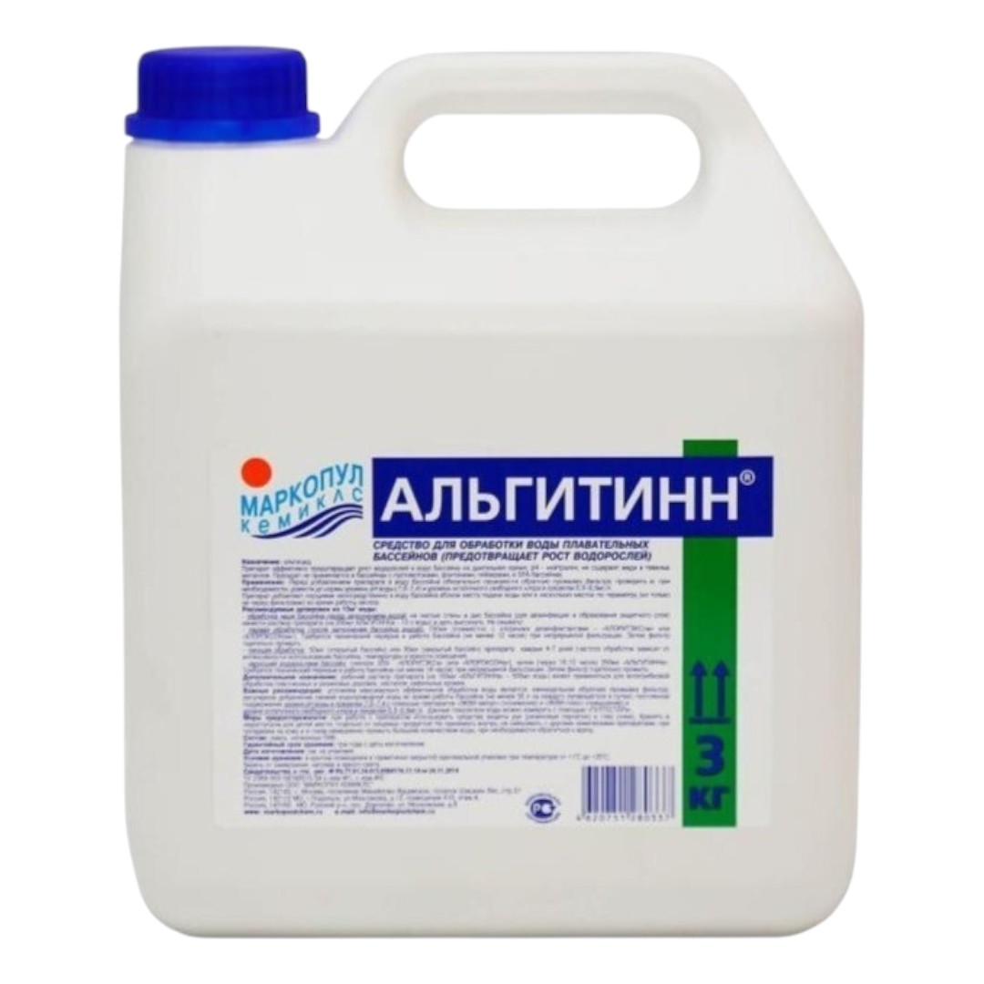 Маркопул Кемиклс Альгитинн (Альгицид) - жидкое средство против водорослей. Эффективно ликвидирует споры бурого планктона, мешает развитию процесса обмена веществ у водорослей, что приводит к их гибели, и предотвращает их дальнейшее появление. Кроме этого, препарат позваляет бороться с помутнением воды. Добавляется в воду бассейна вручную или с помощью дозирующего устройства.