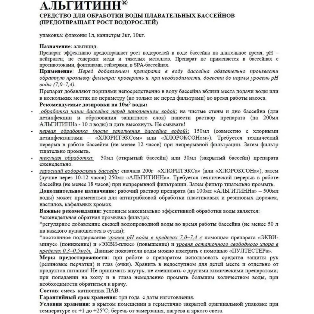 • Заросший водорослями бассейн: 200г «ХЛОРИТЭКСа» или «ХЛОРОКСОНа» на 10м³ воды, затем (через 10-12ч) 250мл «АЛЬГИТИННа».