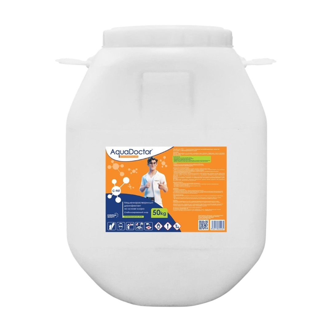 AquaDoctor C-90T - медленнорастворимый, сильнодействующий препарат для регулярного обеззараживания воды в бассейне. Эффективно и быстро уничтожает бактерии, грибки, вирусы, водоросли. Разрушает органические вещества, вызывающие помутнение и загрязнение воды в бассейнах.