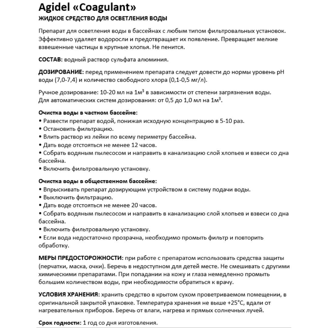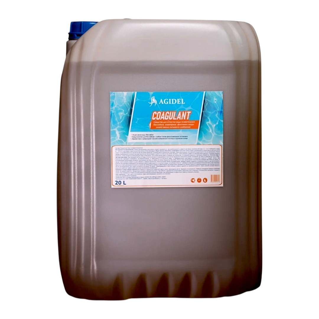 Agidel Coagulant - жидкое непенящееся средство для осветления воды в бассейнах с любым типом фильтровальных установок. Эффективно удаляет водоросли и предотвращает их появление. Превращает мелкие взвешенные частицы в крупные хлопья.