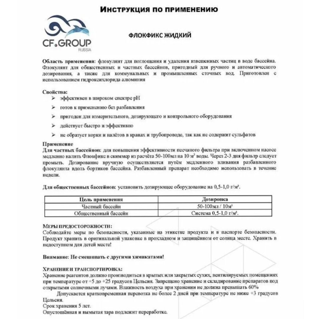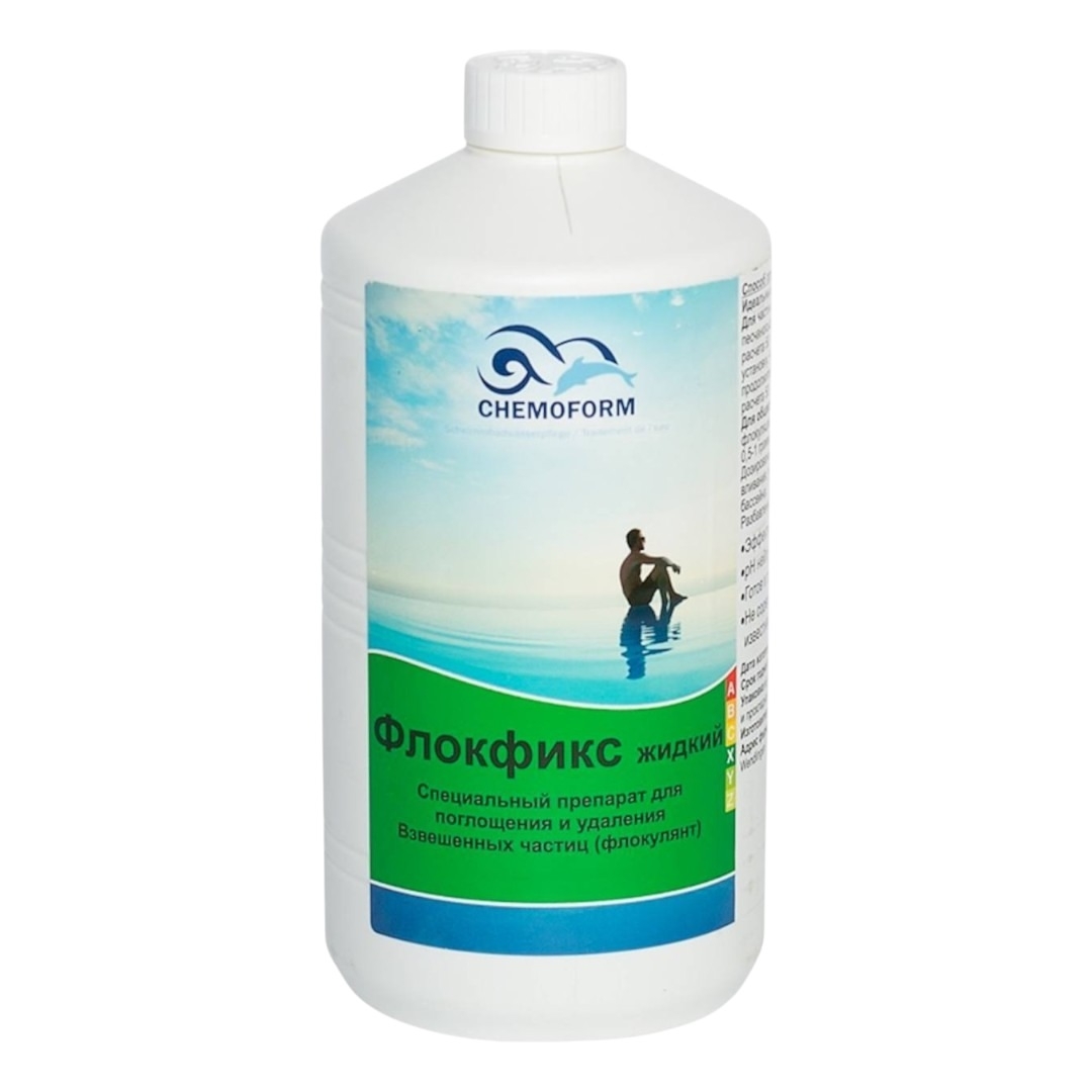 Chemoform Флокфикс - жидкое средство для поглощения и удаления взвешенных частиц в воде бассейна. Применяется для коагуляции. Подходит для общественных, частных, промышленных и коммунальных бассейнов. Может быть использован для ручного и автоматического дозирования. Также подходит для коммунальных и промышленных сточных вод.