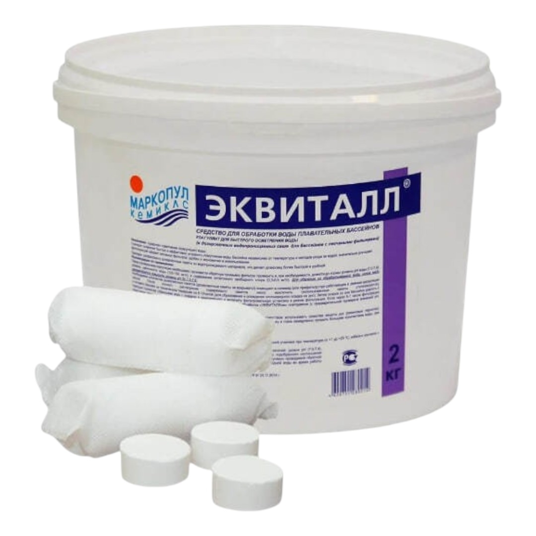 Маркопул Кемиклс Эквиталл - средство для продолжительной коагуляции (осветлении) воды. Благодаря медленно растворимой форме препарат непрерывно и равномерно в течение длительного времени дозирует в воду бассейна коагулирующее средство, что значительно улучшает фильтрационный эффект песочных и цеолитовых фильтров и позволяет удалять из воды бассейна железо, медь и фосфаты. Средство работает постоянно, благодаря медленной растворимости в процессе циркуляции воды непрерывно отфильтровываются мелкие частицы.