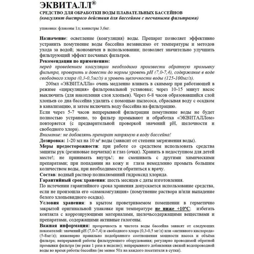 Маркопул Кемиклс Эквиталл - жидкое средство для осветления (коагуляции) воды. Препарат позволяет эффективно устранить помутнение воды бассейна независимо от температуры и методов ухода за водой. Обладает ячеистой «изломанной» структурой, что позволяет в сжатые сроки: от трёх до двенадцати часов осаждать любые посторонние примеси и взвеси (в том числе образовавшиеся и после борьбы с водорослями).