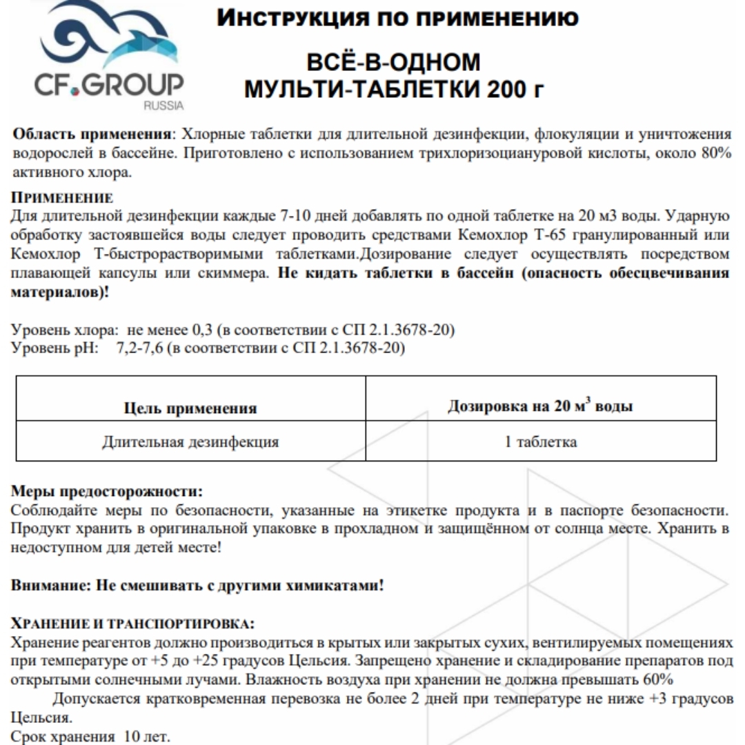 • Длительная дезинфекция: 1 таблетка на 20м³ воды (каждые 7-10 дней)