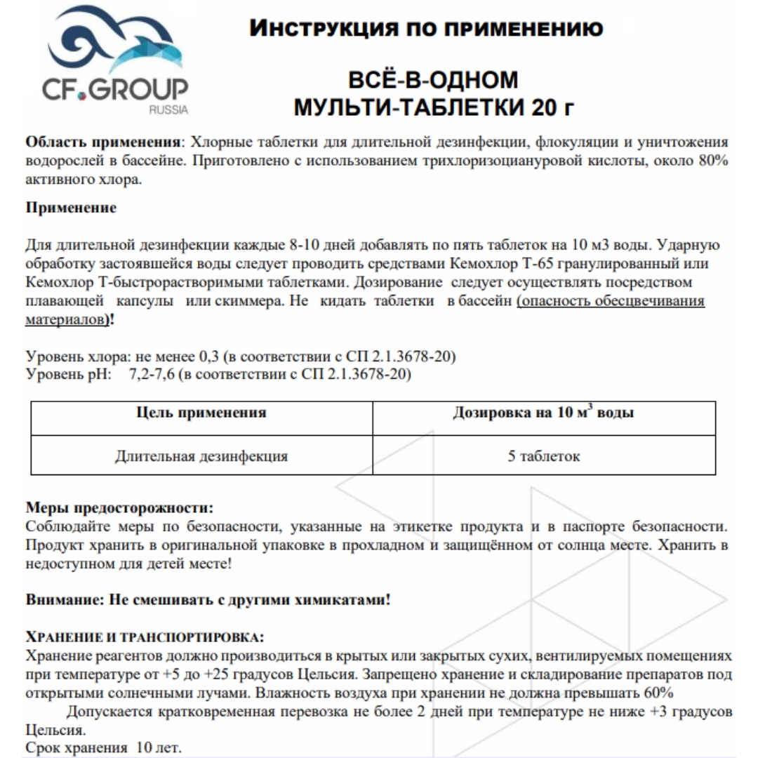 • Длительная дезинфекция: 5 таблеток на 10м³ воды (каждые 8-10 дней)
