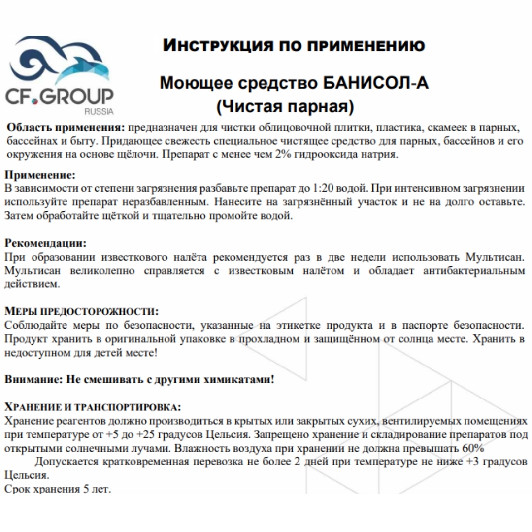 Chemoform Банисол А - препарат для чистки облицовочной плитки, пластика, скамеек в парных, бассейнах и быту на основе щёлочи. Эффективен против жирных загрязнений и продуктов жизнедеятельности человека.